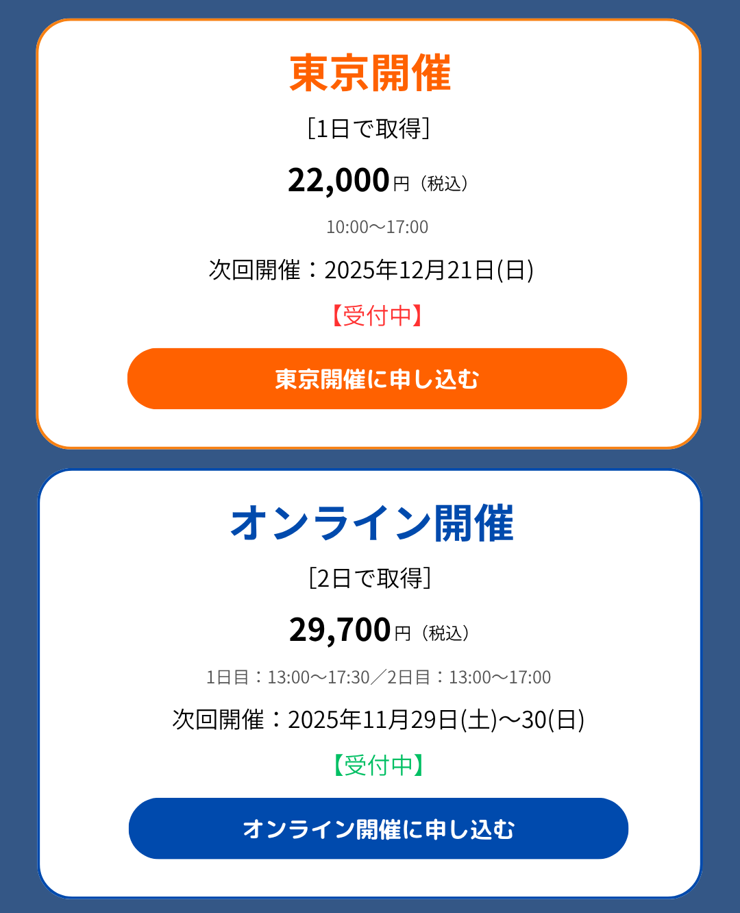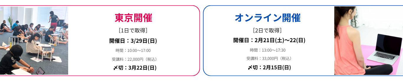 東京開催がおすすめです。講師が直接指導できますので、体感覚を得やすく、正しい動きや感覚の理解がスムーズです。また、指導練習でも相手役を観察しやすいという利点があります。加えて、参加者同士でコミュニケーションを取りながら進行しますので、気づきの共有や質問もしやすかったというお声を頂いております。