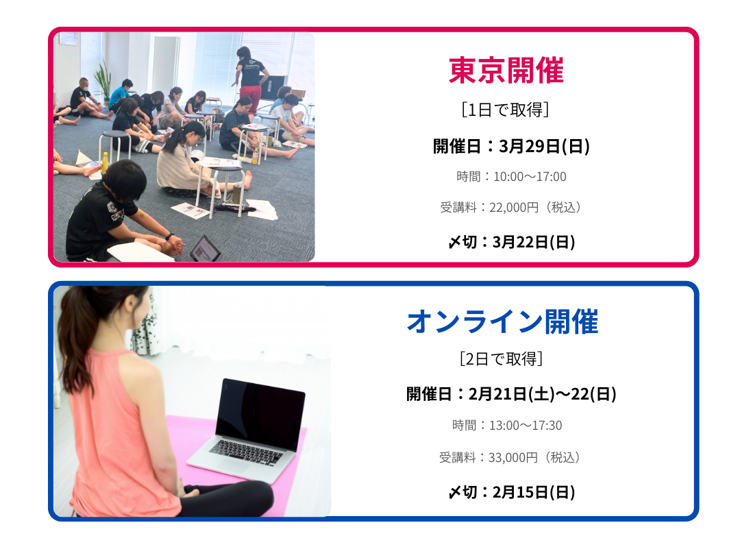 一方でオンラインは、ご自宅から受講できるので、移動の時間や交通費をかけることなく気軽に参加できます。また、周りの目を気にせず集中出来たというお声も頂いております。オンラインでも、講師がひとりひとり姿勢や動きを確認しながら行いますので、知識や技術は十分に得ることができますし、もちろん質疑応答も行いますので、ご安心ください。
