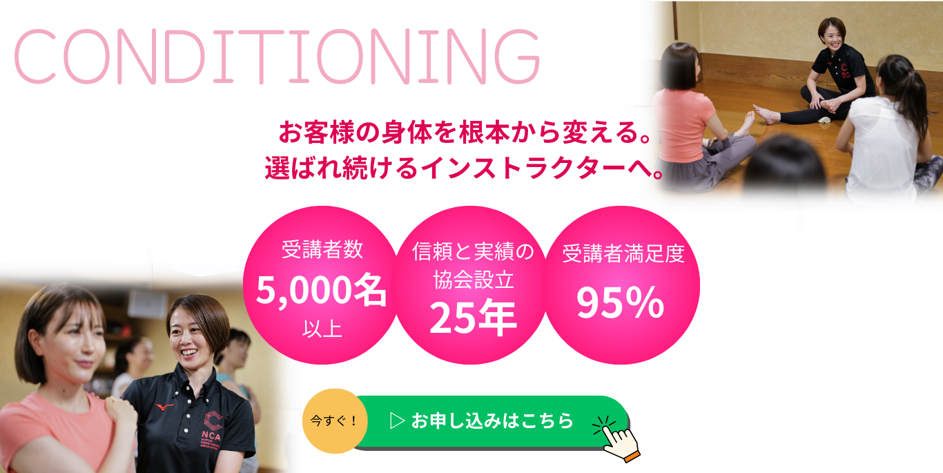 バレトンや筋トレなど、様々な運動を行っている私の施設ですが、どのプログラムでも最初はコンディショニングで筋肉を使える状態にし、最後には疲労が残らないように整えて終わるという構成にしています。おかげで、主運動の効果も高まりますし、怪我なく、不調なく、お客様に運動を楽しんで頂いています。